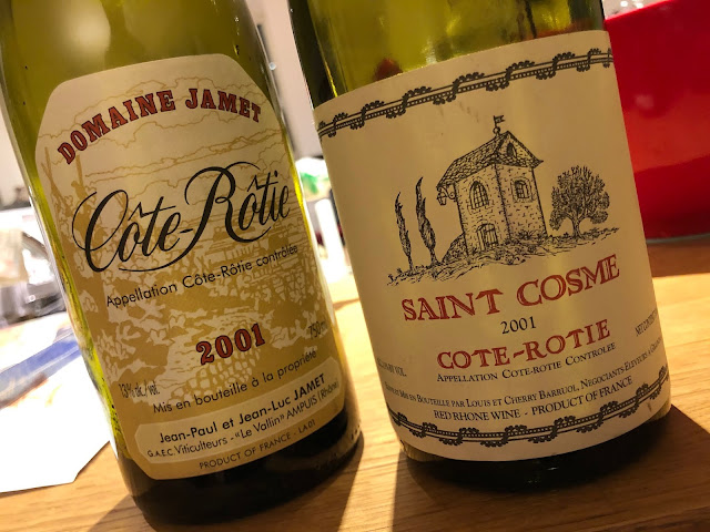 The Côte-Rôtie´s came from my and Roderick´s cellar so we tasted these non blind. The 99 Jamet sports a semi mature, deep nose with notes of violets, dried up blackberry jam, moist earth and black pepper. Very, very good.